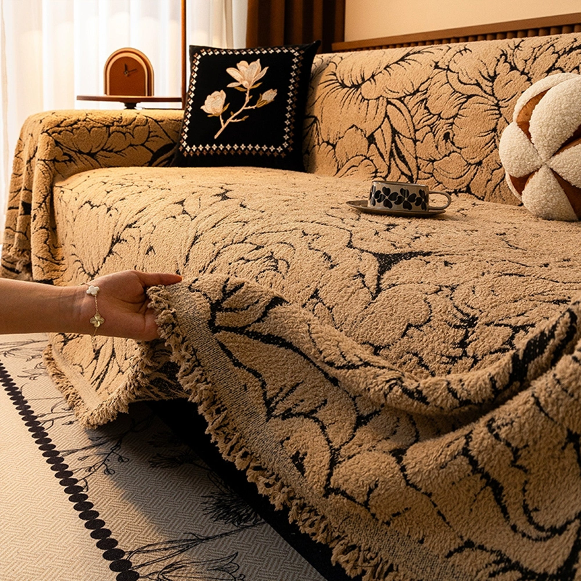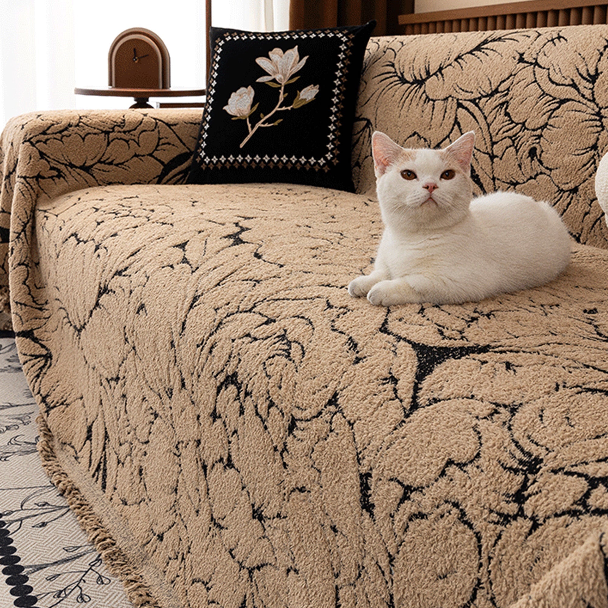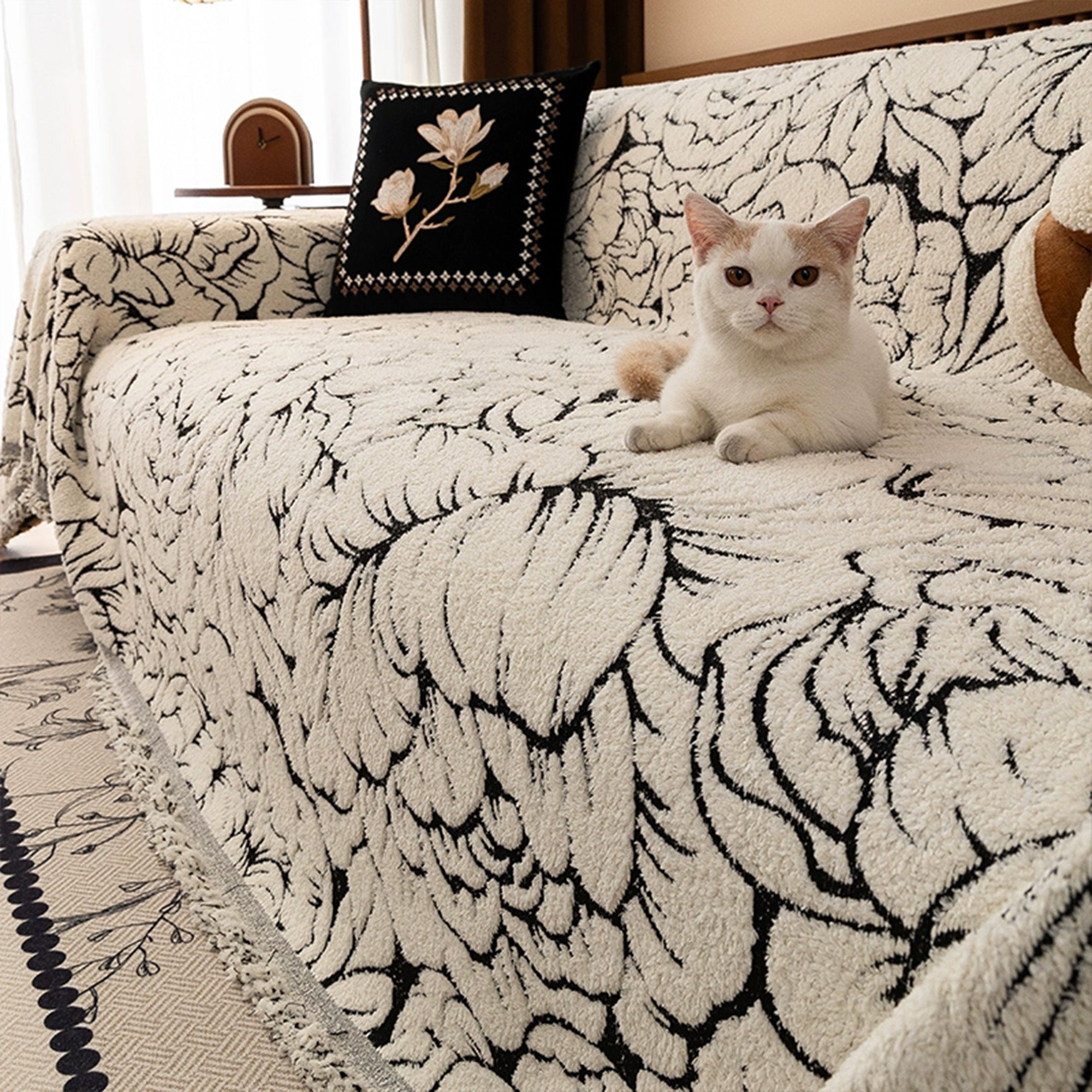 Wrap your sofa in soft luxury with our Cozy Bloom Plush Anti-Scratch Sofa/Couch Cover. The plush, pet-friendly pile features an elegant floral line pattern that elevates any room while shielding your seating from daily wear, fur, and scratches. Dense weave + non-slip backing keep every panel snug through sits, naps, and play. Easy to drape, easy to care—instant refresh in seconds.