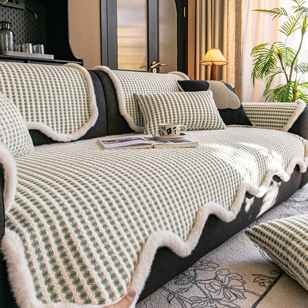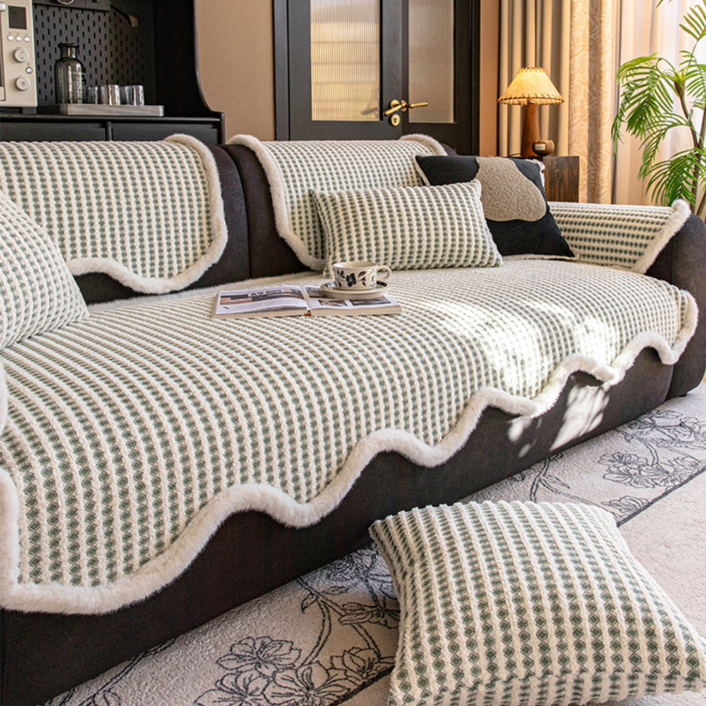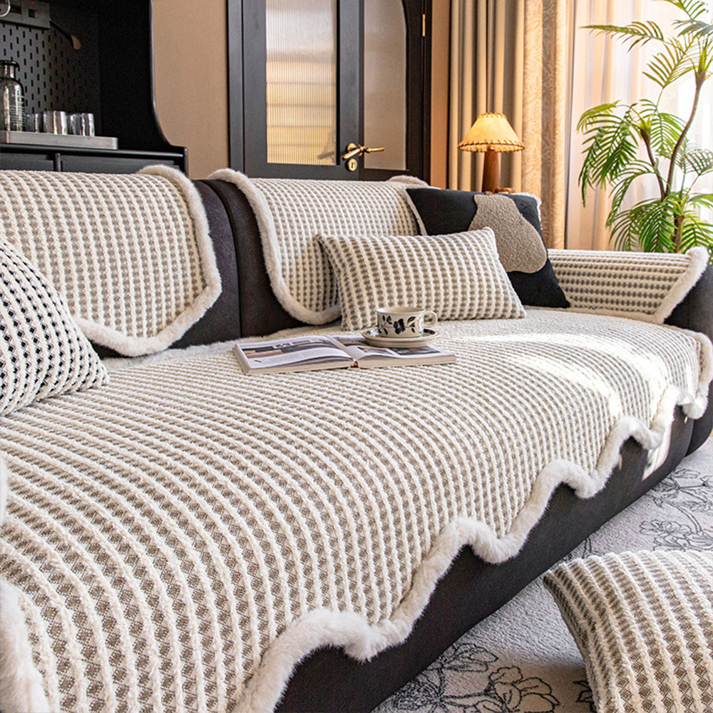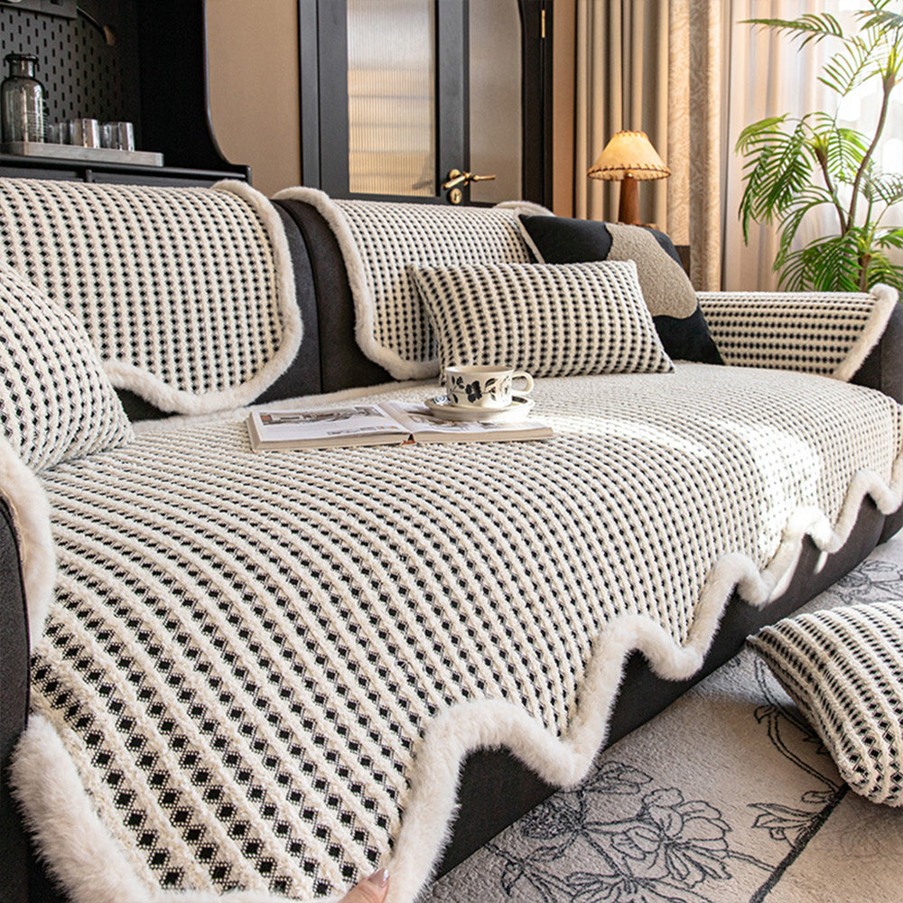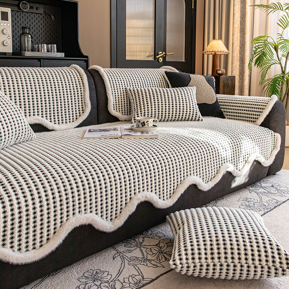 Elevate your leather sofa with refined texture and effortless elegance using our Luxe Curve Trim Chenille Nonslip Sofa/Couch Cover. Designed for straight-row leather sofas, this cover blends light-luxury aesthetics with everyday practicality. The subtle geometric weave pairs beautifully with the soft, sculpted curved faux-fur edging, creating a layered, designer look that feels both modern and cozy.